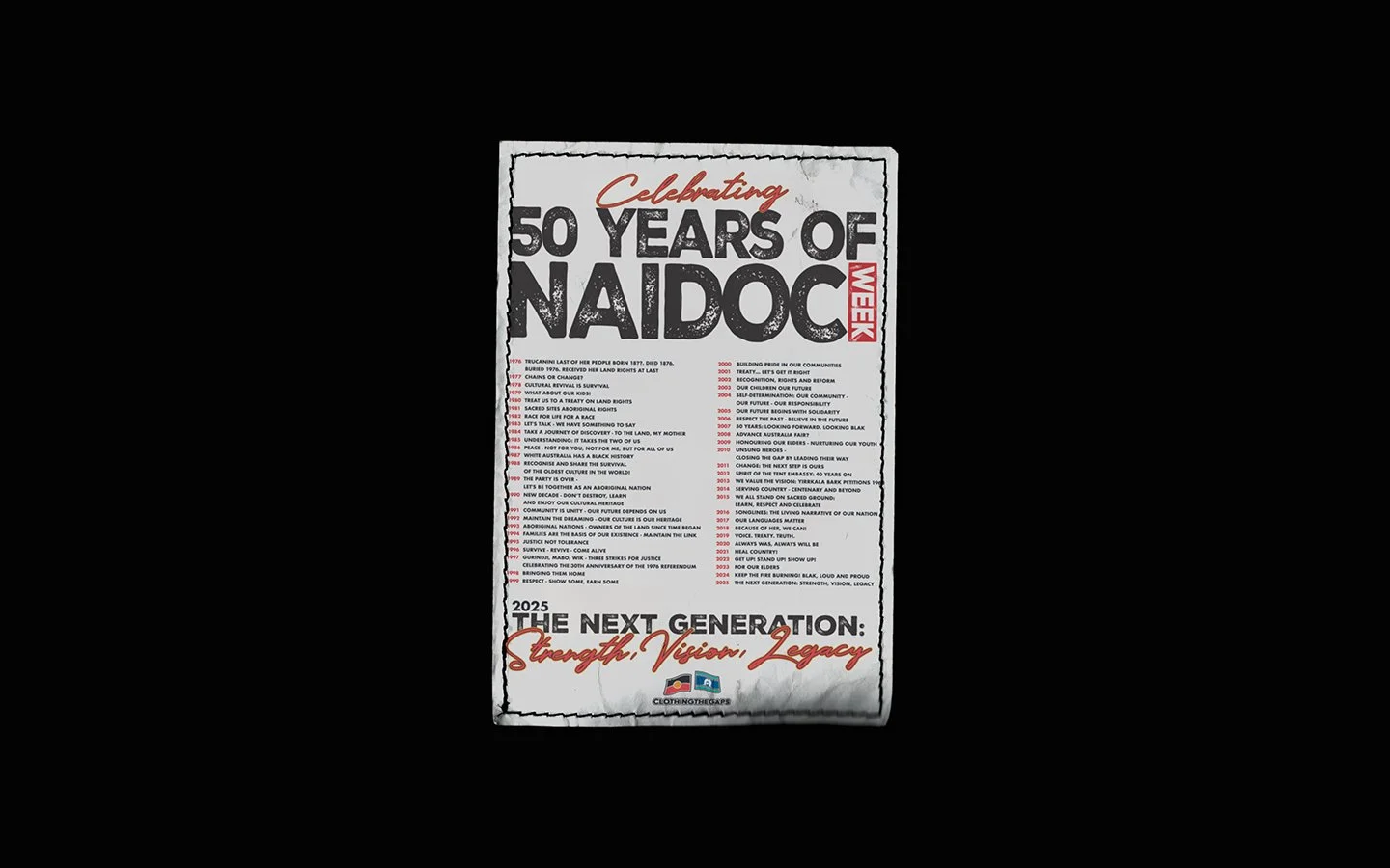 For NAIDOC 2025, Clothing the Gaps partnered with us to create a bold and memorable identity for the theme “The Next Generation: Strength, Vision, Legacy.” Celebrating 50 years of NAIDOC Week, the goal was to honour the past while looking ahead with visuals that would inspire pride, reflect community, and stand strong across platforms.