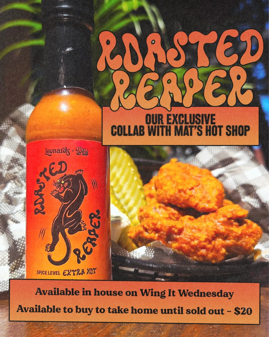 Leonard’s approached us to develop the branding and packaging for an exclusive collaboration with Melbourne’s Mat’s Hot Shop. The product was a Roasted Reaper hot sauce, created specifically for their Wing It Wednesday specials night.